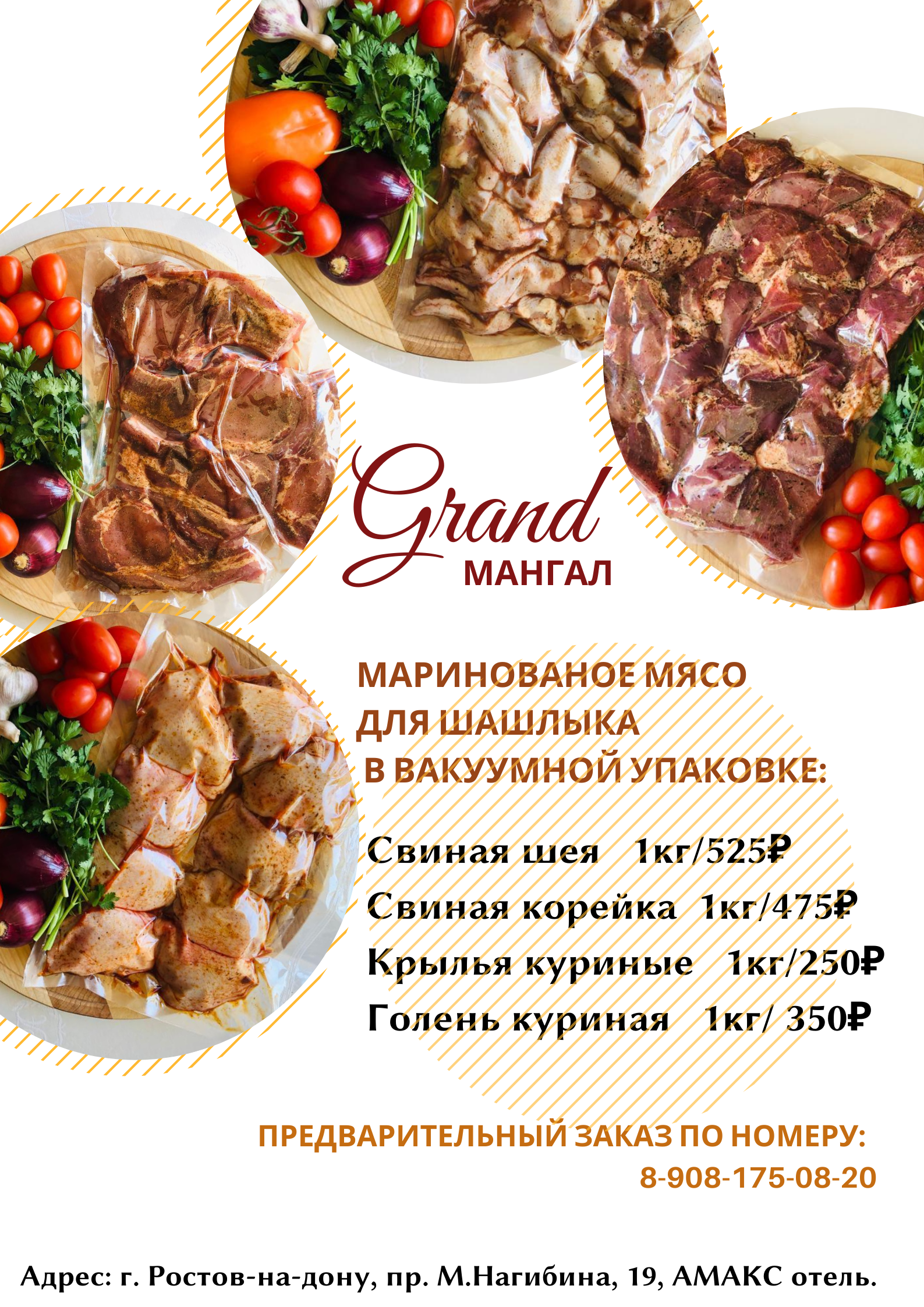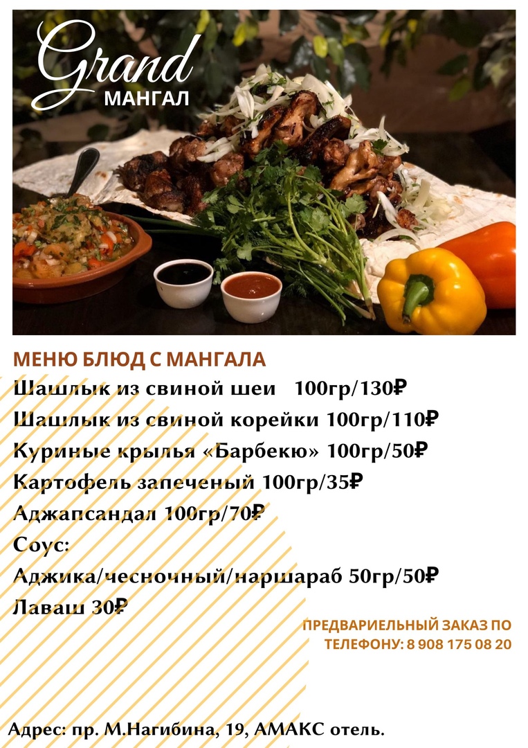 AMAKS Конгресс-отель рад сообщить об открытии нашего летнего ресторана «Grand Мангал»! Мы осуществляем доставку готового шашлыка, различных блюд на мангале, а также маринованного мяса в вакуумной упаковке!